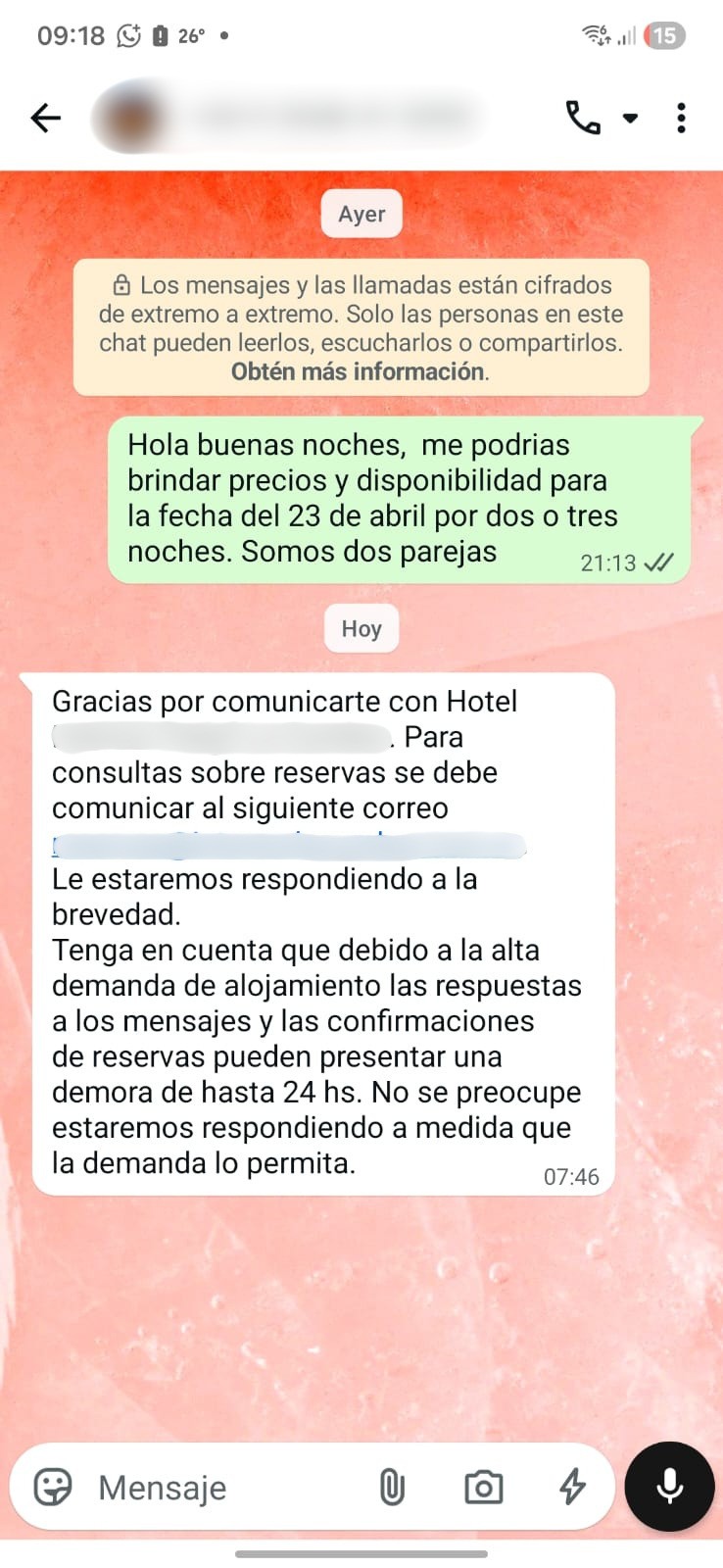 Un huésped encuentra tu hotel. Le gusta. Escribe por WhatsApp a las 9 de la noche preguntando disponibilidad para el finde. Nadie responde esa noche. A la mañana llega el autoresponder: "Para reservas escribir al mail. Demora hasta 24hs." A las 9:05 ese huésped ya confirmó en Booking. Y vos pagaste el 15% de comisión sobre una reserva que llegó directo a tu teléfono.
